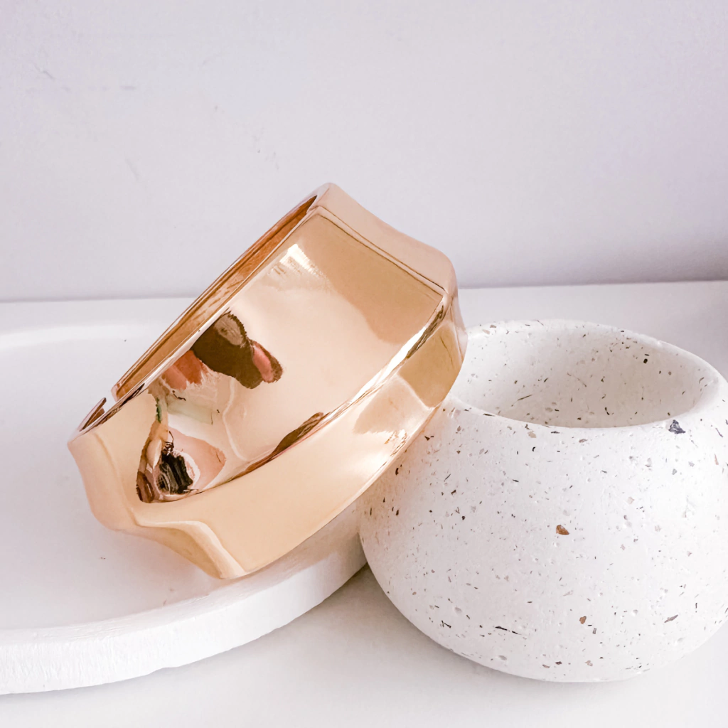 É uma peça que traduz elegância e estilo contemporâneo com um toque artesanal. Seu design em ondas e acabamento polido reflete a luz com intensidade, proporcionando um brilho marcante que eleva qualquer produção.